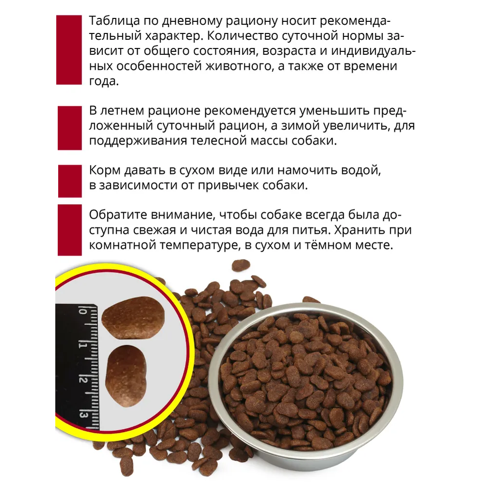 | Дозировка | - до 5 кг / менее 80 г - 5-15 кг / 80-170 г - 15-30 кг / 170-340 г - 30-45 кг / 340-460 г - 45-60 кг / 460-560 г - более 60 кг / +10,5 г/кг |