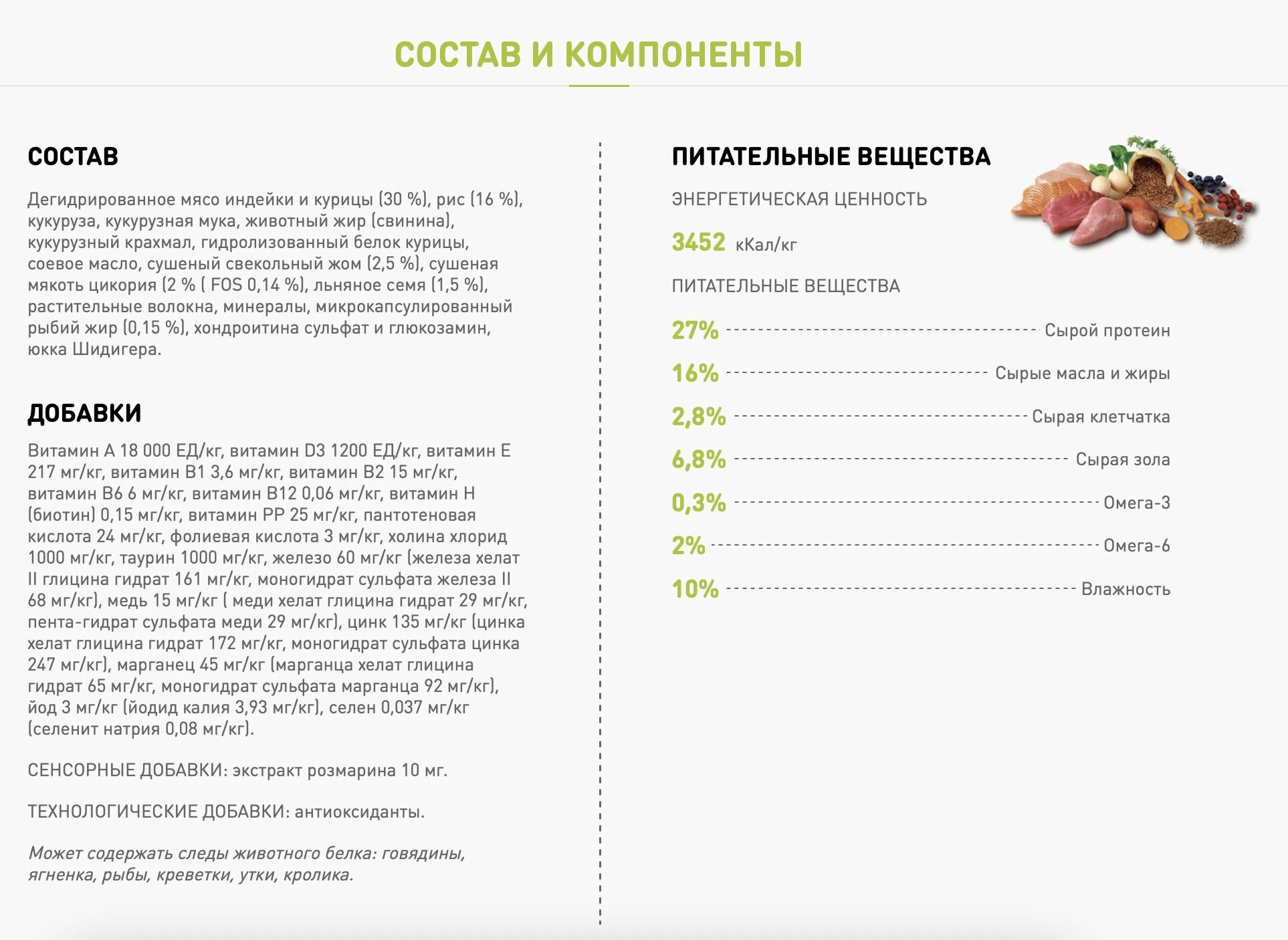 | Состав | дегидратированное мясо (индейка 18%), кукуруза, рис (15%), животный жир, ячмень, рыбная мука 5%, кукурузный глютен, сушеный свекловичный жом, фруктоолигосахариды (fos) 1%, подсолнечное масло 0,8%, сухие яичные продукты, сухие дрожжи, калия хлорид, натрия хлорид, дикальций фосфат, Юкка шидигера, глюкозамин (400 мг/кг), биологический комплекс растительных экстрактов 0,03% (гвоздика, цитрусовые, виноградная лоза, розмарин, куркума) |