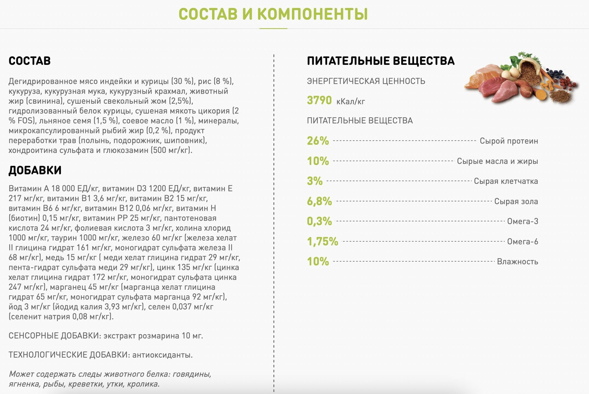 | Особые потребности | для здоровья кожи и блеска шерсти / при склонности к избыточному весу / при чувствительном пищеварении |
