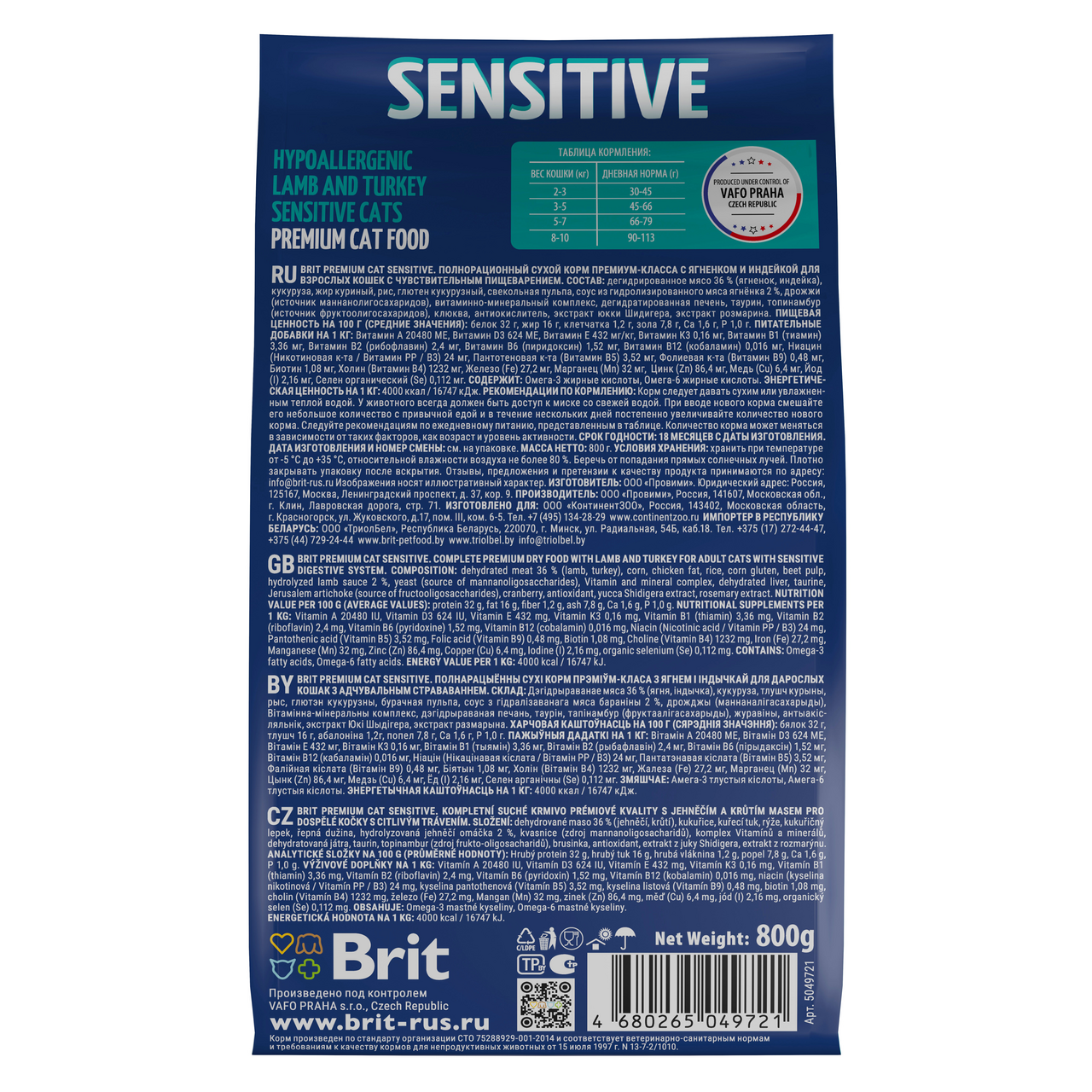 Корм BRIT 800гр для кошек с чувствительным пищеварением с индейкой и ягненком Premium Cat Sensitive