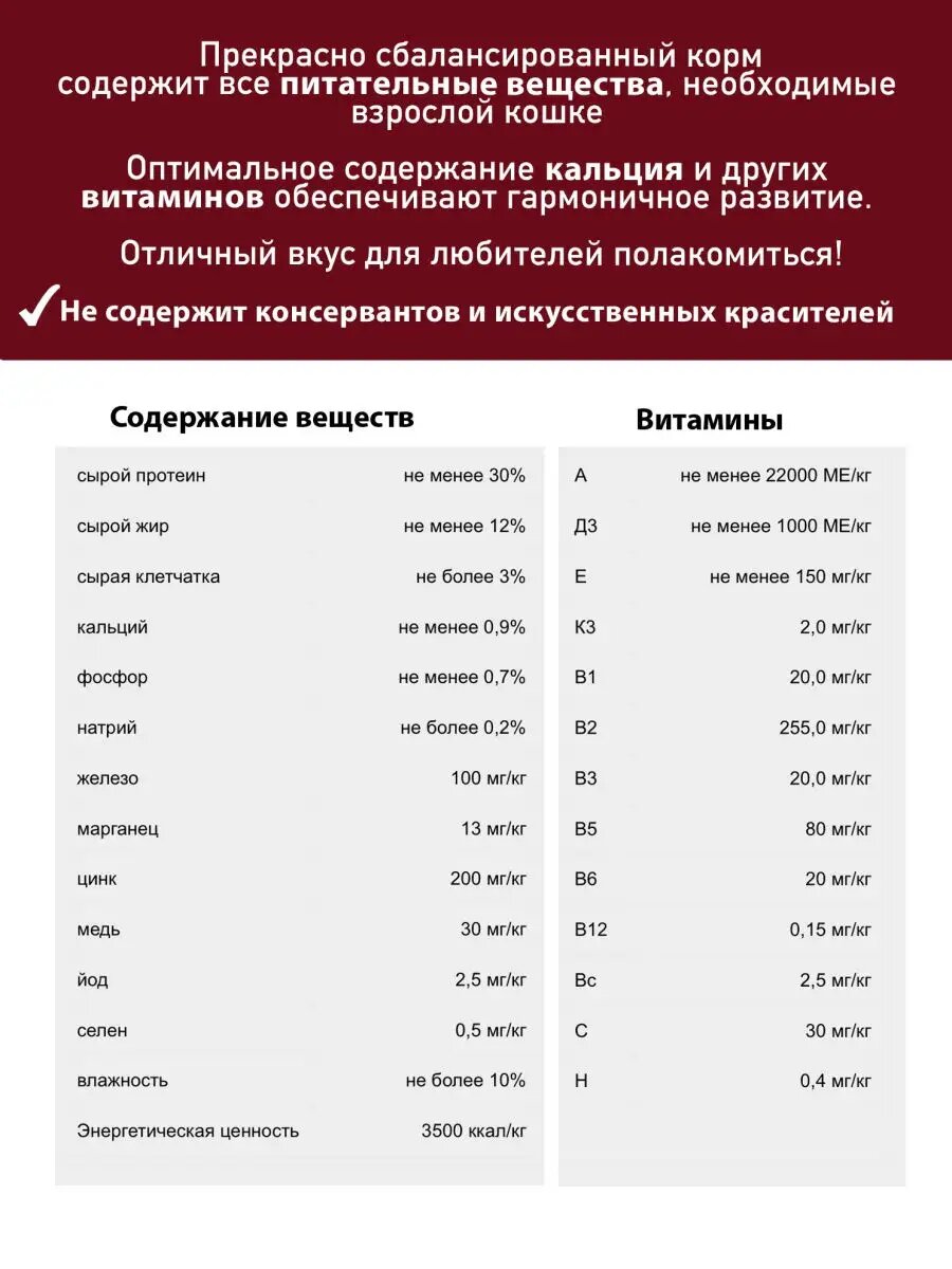 | Состав | мясная мука, зародыш пшеничный, молоко сухое, злаки, глютен кукурузный, комбинация растительных и животных жиров, дрожжи, минералы, витамины, микроэлементы |