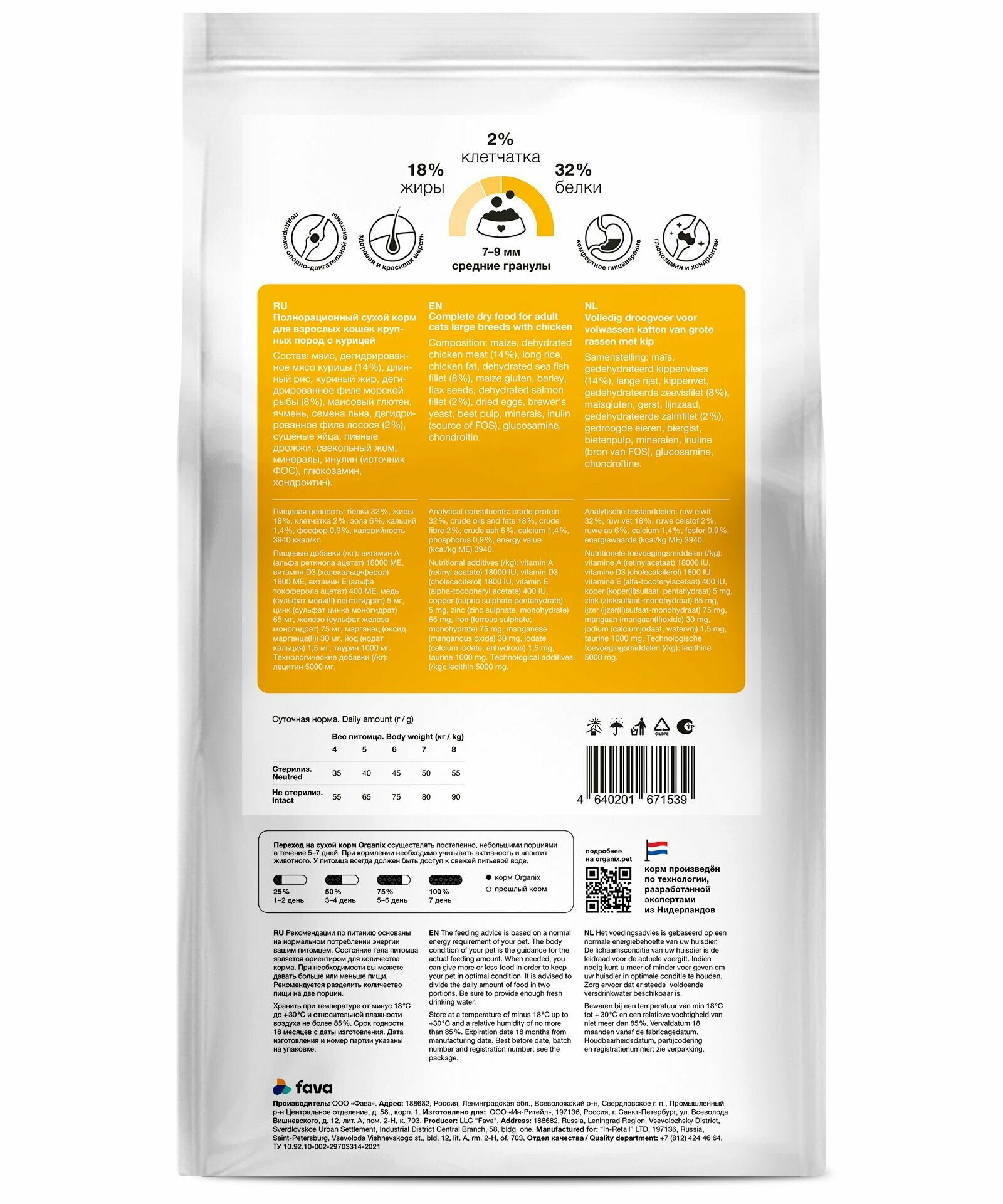 | Состав | Маис, дегидрированное куриное мясо (14%), маис, длинный рис, куриный жир, дегидрированное филе морской рыбы (8%), маисовый глютен, ячмень, семена льна, дегидрированное филе лосося, сушеные яйца, пивные дрожжи, свекольный жом, минералы, инулин (источник ФОС), глюкозамин, хондроитин |