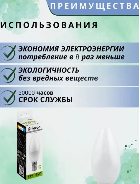 1шт/уп. Лампа LED Свеча 9Вт 230B C37 E14 840Лм 6400К Свет Холодный белый арт. 25800 Feron, уп. 1шт