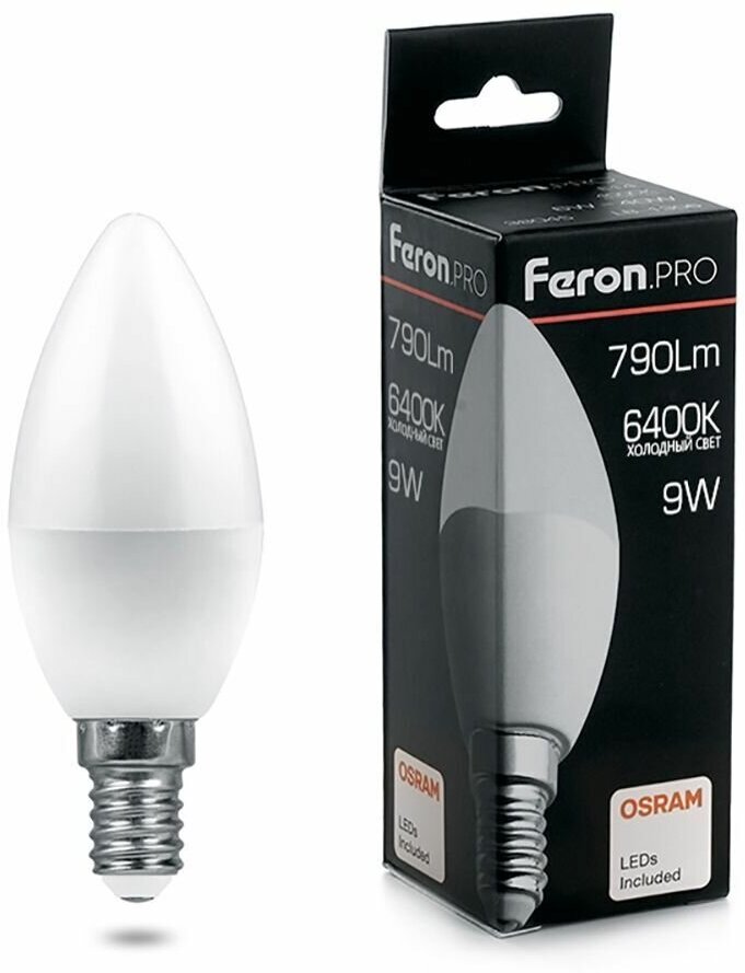 Лампа светодиодная . PRO LB-1309 Свеча E14 9W 6400K, FERON 38061 (1 шт.)