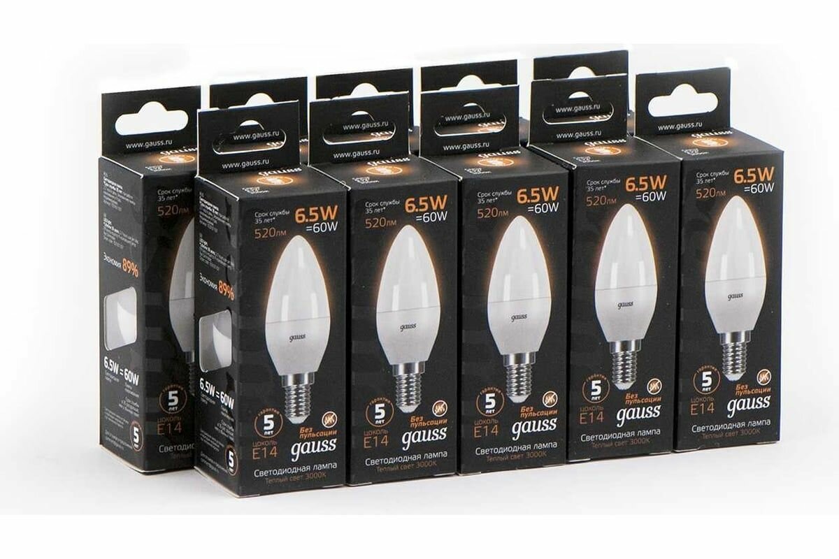 (5 шт) Лампа Gauss Свеча 6.5W 520lm 3000К E14 LED 1/10/100