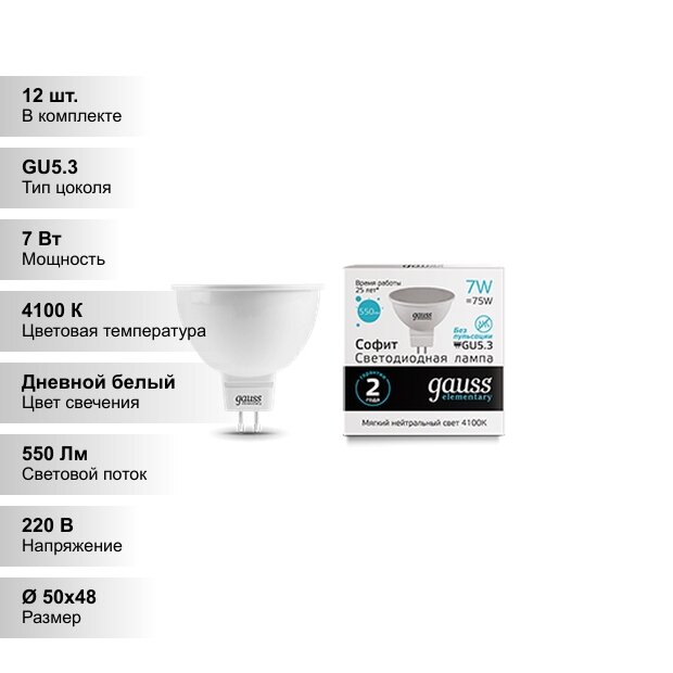 (12 шт.) Светодиодная лампочка Gauss MR16, мощность 5.5 Вт, напряжение питания 220 В, цветовая температура 3000 К, теплый белый свет, световой поток 430 Лм, цоколь GU5.3, размер 50х50 мм