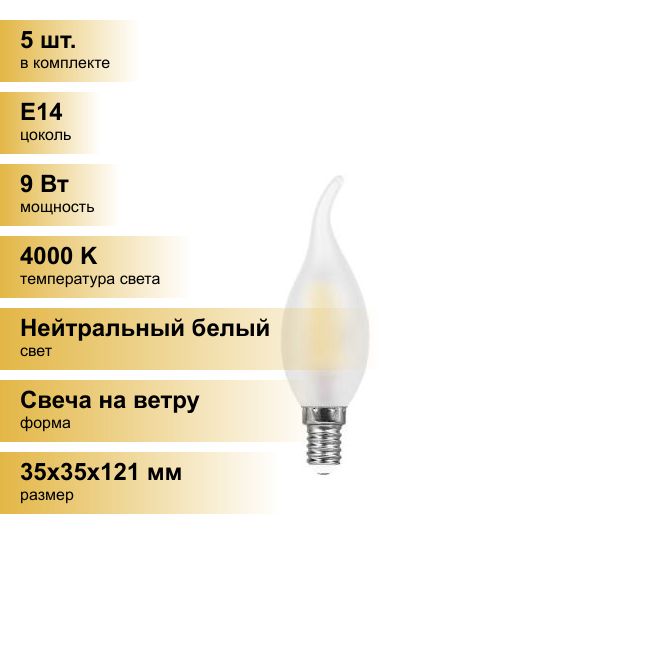Купить (5 шт.) Светодиодная лампочка Feron филамент свеча на ветру C35 E14 9W(820lm) 4000K 4K матовая 121x35мм LB-74 25961 Нейтральный белый. Цоколь E14