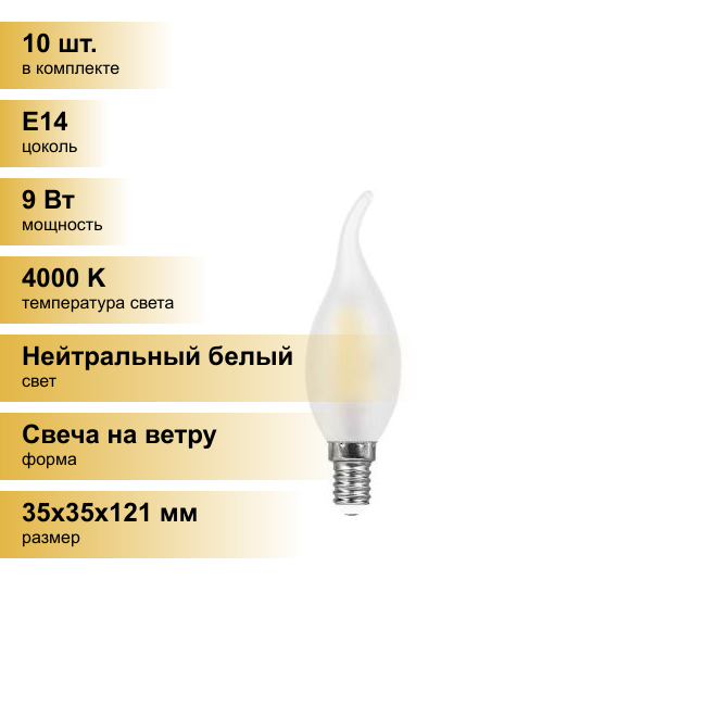 Сохранить(10 шт.) Светодиодная лампочка Feron филамент свеча на ветру C35 E14 9W(820lm) 4000K 4K матовая 121x35мм LB-74 25961 Нейтральный белый. Цоколь E14 интересное: