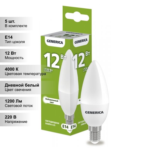 Лампа светодиодная GENERICA C35, 12 Вт, свеча, 4000 К, E14, 230 В, LL-C35-12-230-40-E14-G