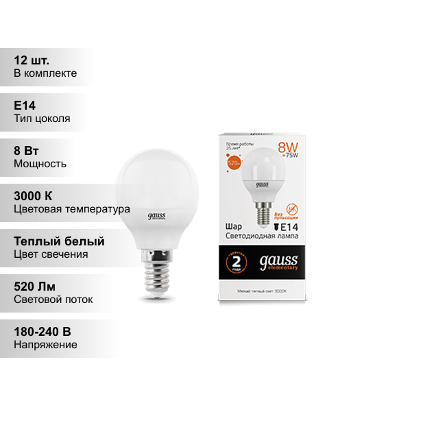 (2 шт)Лампа Gauss Elementary Шар 8W 520lm 3000K Е14 LED 1/10/100