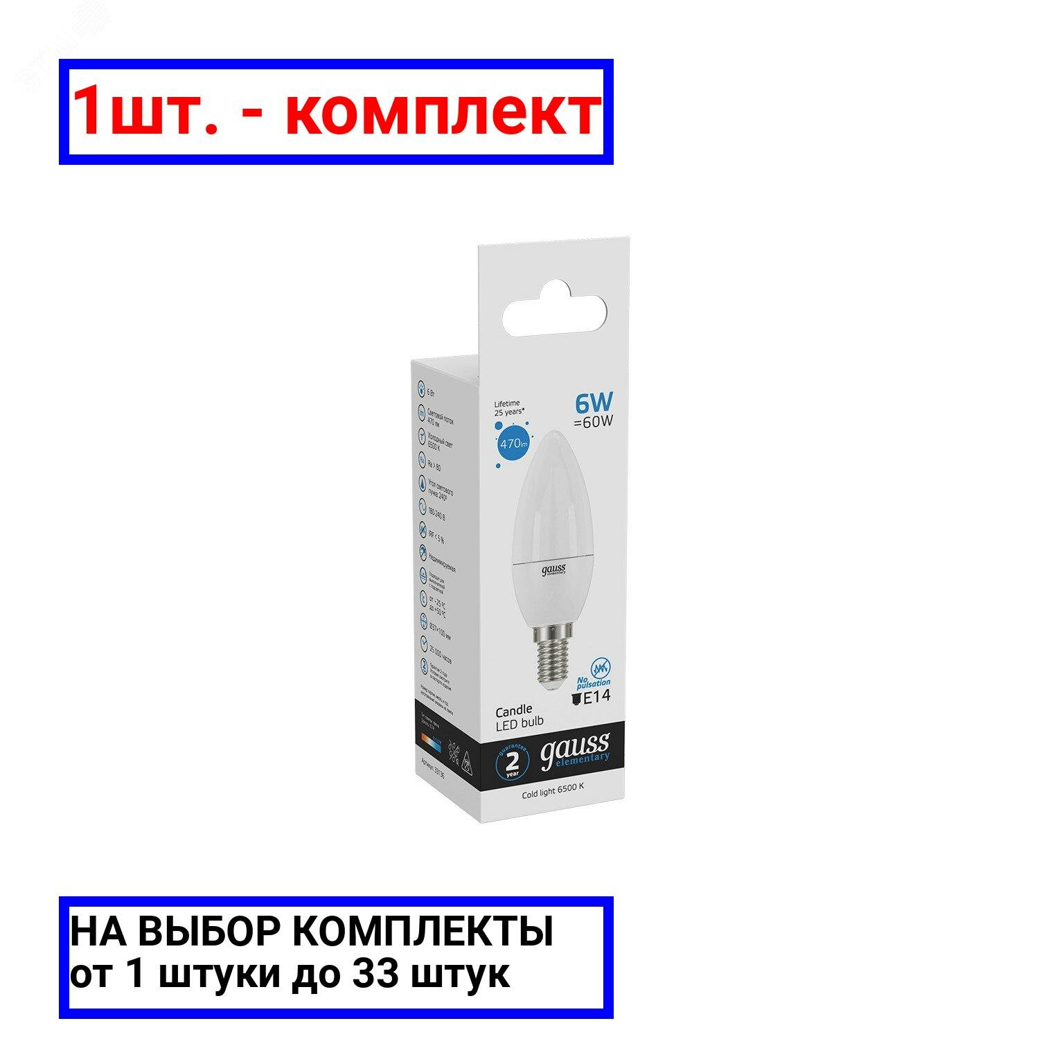 Лампа светодиодная Gauss Elementary 6Вт цок.:E14 свеча 220B 6500K св.свеч.бел.хол. C37 (упак.:1шт) (33136)