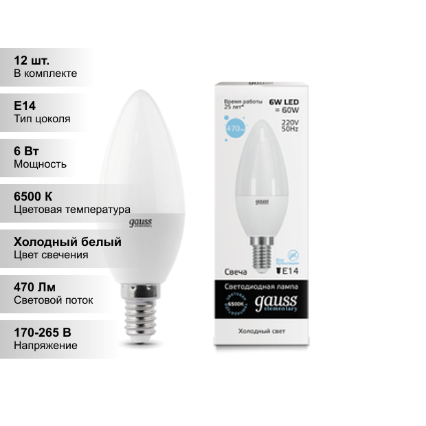 Лампа Gauss Elementary Свеча Е14, 6 Вт, 470ЛМ, 6500K