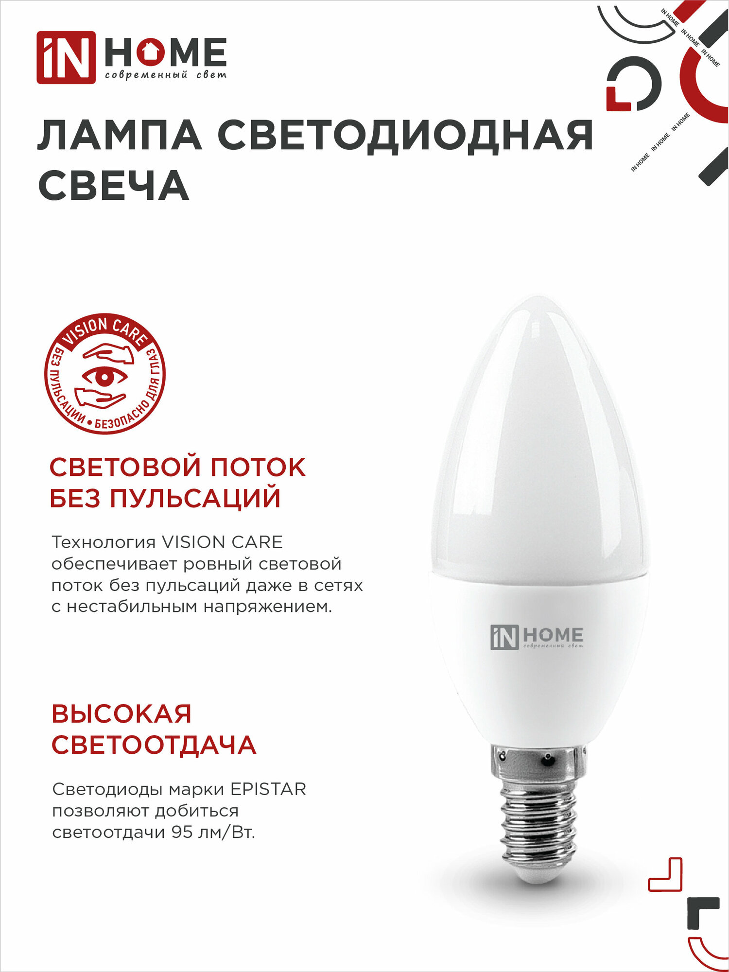 Лампа светодиодная IN HOME LED-СВЕЧА-6Вт 230В Е14 4000К 570Лм, нейтральный белый свет, 5 шт