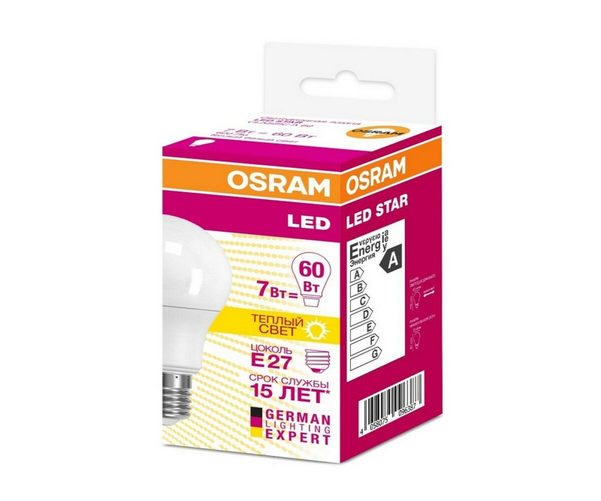 СохранитьOsram Светодиодная лампа LED STAR A Стандарт 7Вт E27 600 Лм 2700 К Теплый белый свет 4058075096387 интересное: