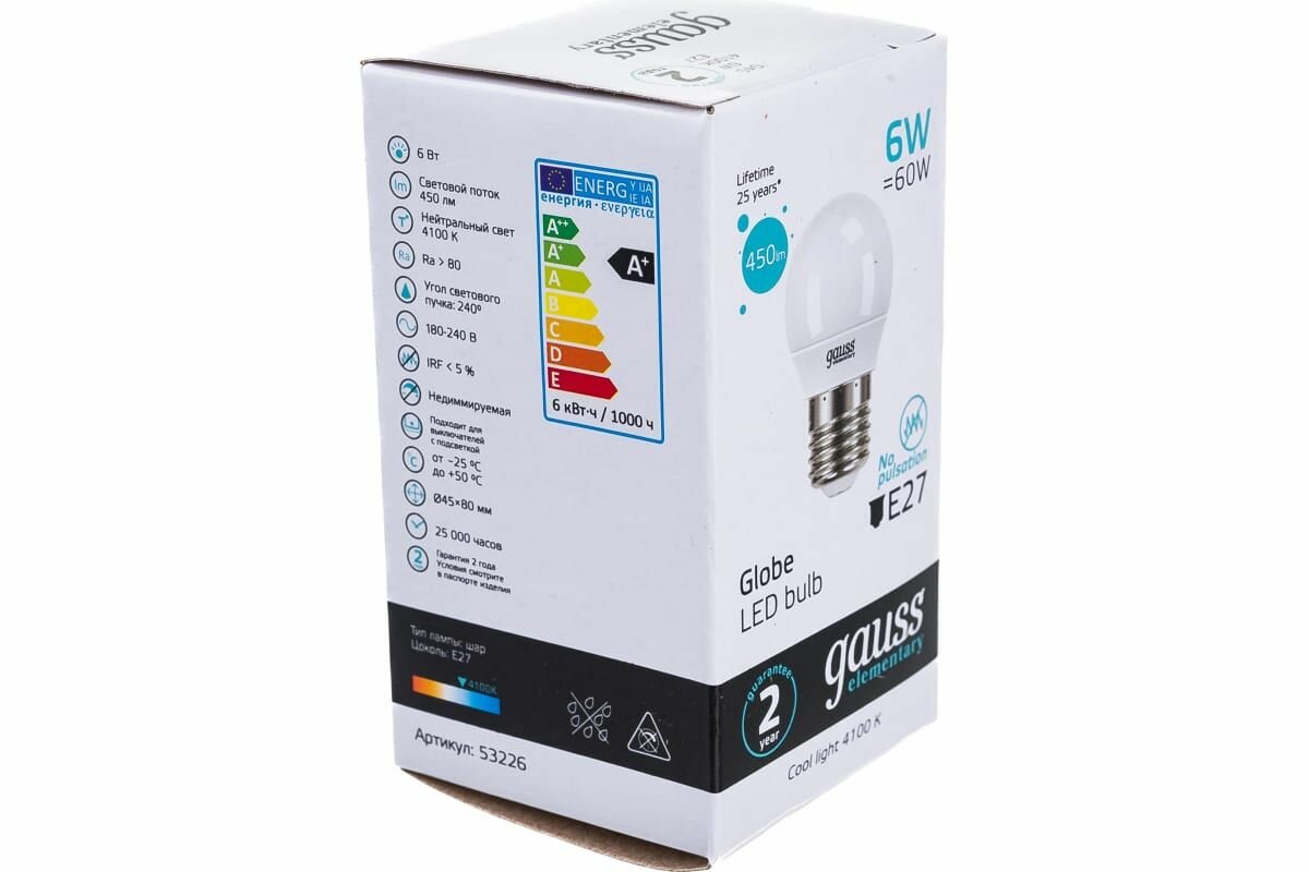 Лампа светодиодная Elementary 6Вт шар 4100К бел. E27 450лм 180-240В, GAUSS 53226 (1 шт.)