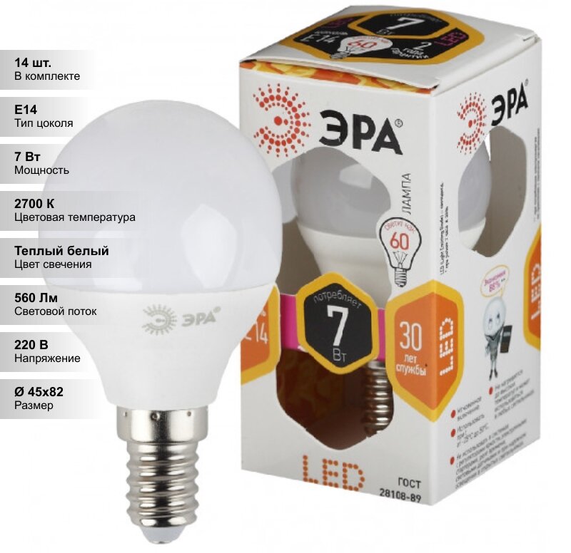Лампа светодиодная P45-7w-827-E14 шар 560лм, ЭРА Б0020548 (1 шт.)