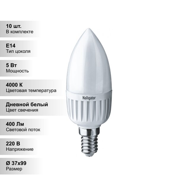 Ниже Вы можете прочитать отзывы на (10 шт.) Светодиодная лампочка Navigator C37 5Вт 230В 4000K E14, ознакомится с подробными характеристиками, посмотреть интересные обзоры и фотографии на (10 шт.) Светодиодная лампочка Navigator C37 5Вт 230В 4000K E14.