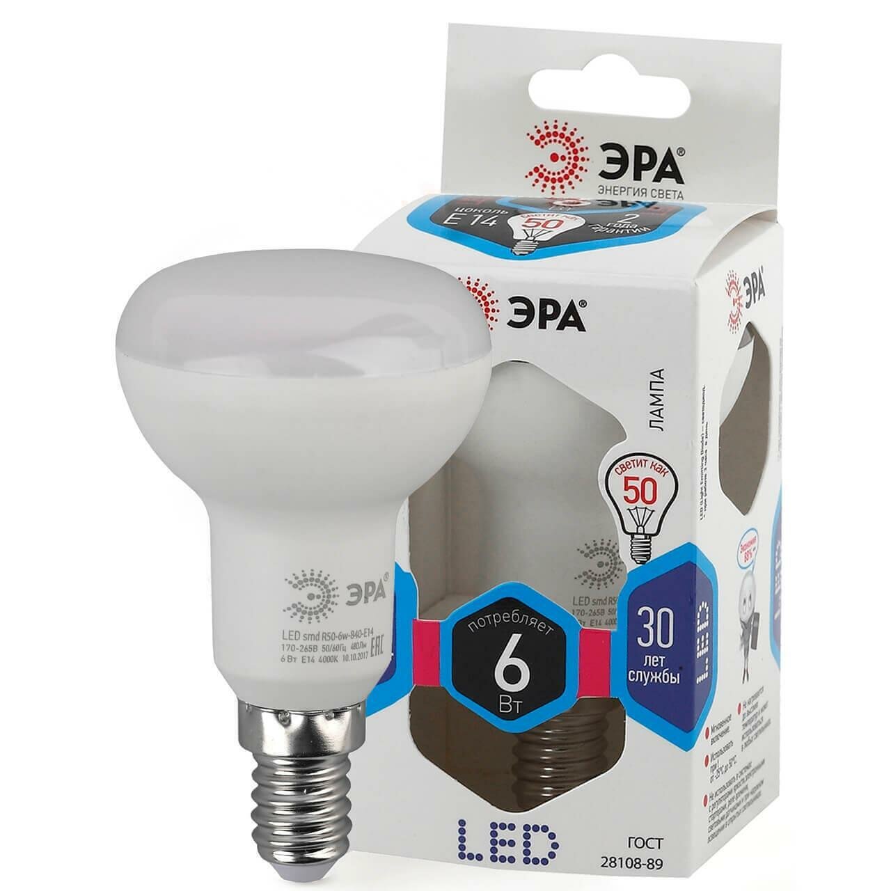 ЭРА LED R50-6W-865-E14 R ЭРА (диод, рефлектор, 6Вт, хол, E14) (10/100/3600)