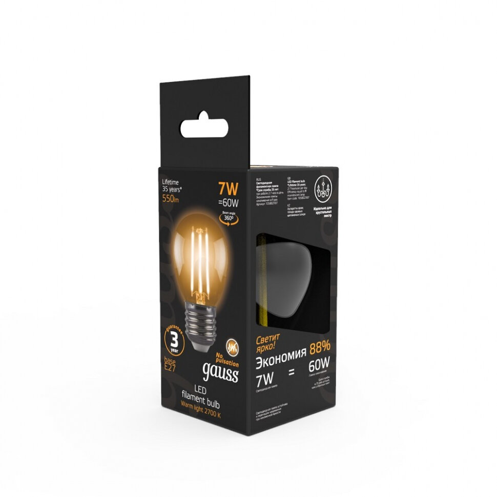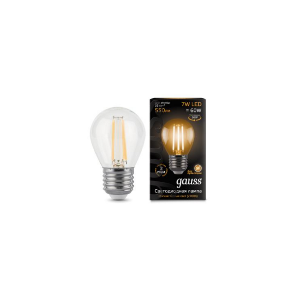 Gauss Filament Шар G45 E27 7W(550lm) 2700K 2K прозр. 80x45 филамент (нитевидная), 105802107 (арт. 645945)