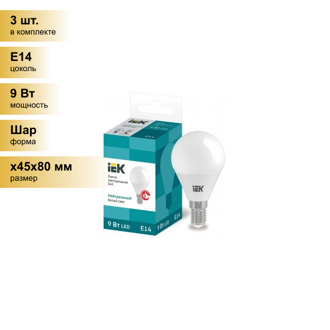 (3 шт.) Светодиодная лампочка IEK шар G45 E14 9W(810lm) 4000К 4K ECO LLE-G45-9-230-40-E14 Нейтральный белый. Цоколь E14