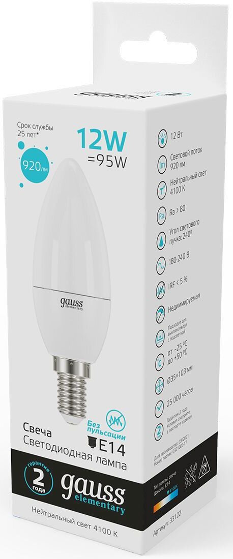 Лампа светодиодная Gauss 12 вт, цоколь е14, свеча, нейтральный белый, 25000 ч, b37-12w-4100-e14