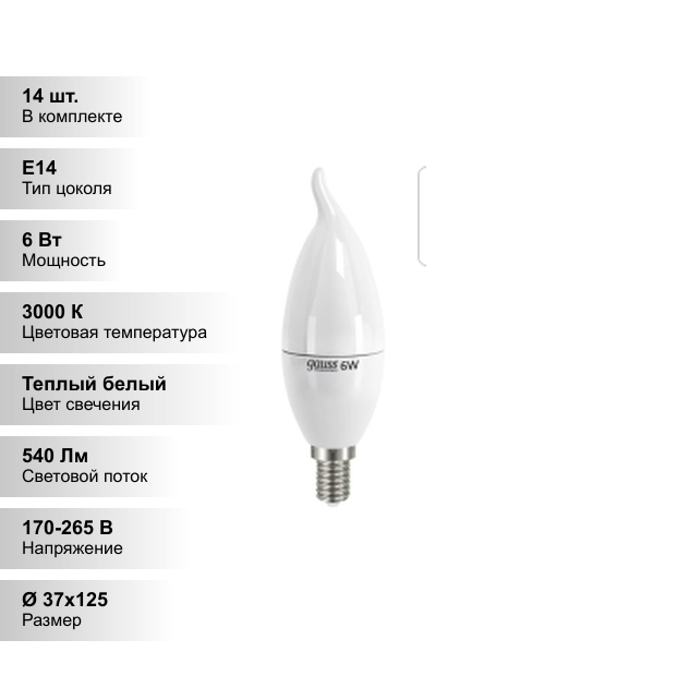 Купить (14 шт.) Светодиодная лампочка Gauss Candle С37, мощность 6 Вт, напряжение 150–265 В, цветовая температура 3000 К, теплый свет, цоколь E14, размер Ø37-125 мм