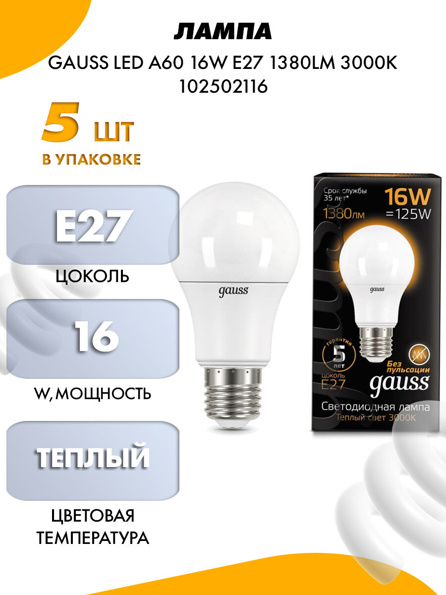 Лампа светодиодная gauss 102502116, E27, A60, 16 Вт, 3000 К