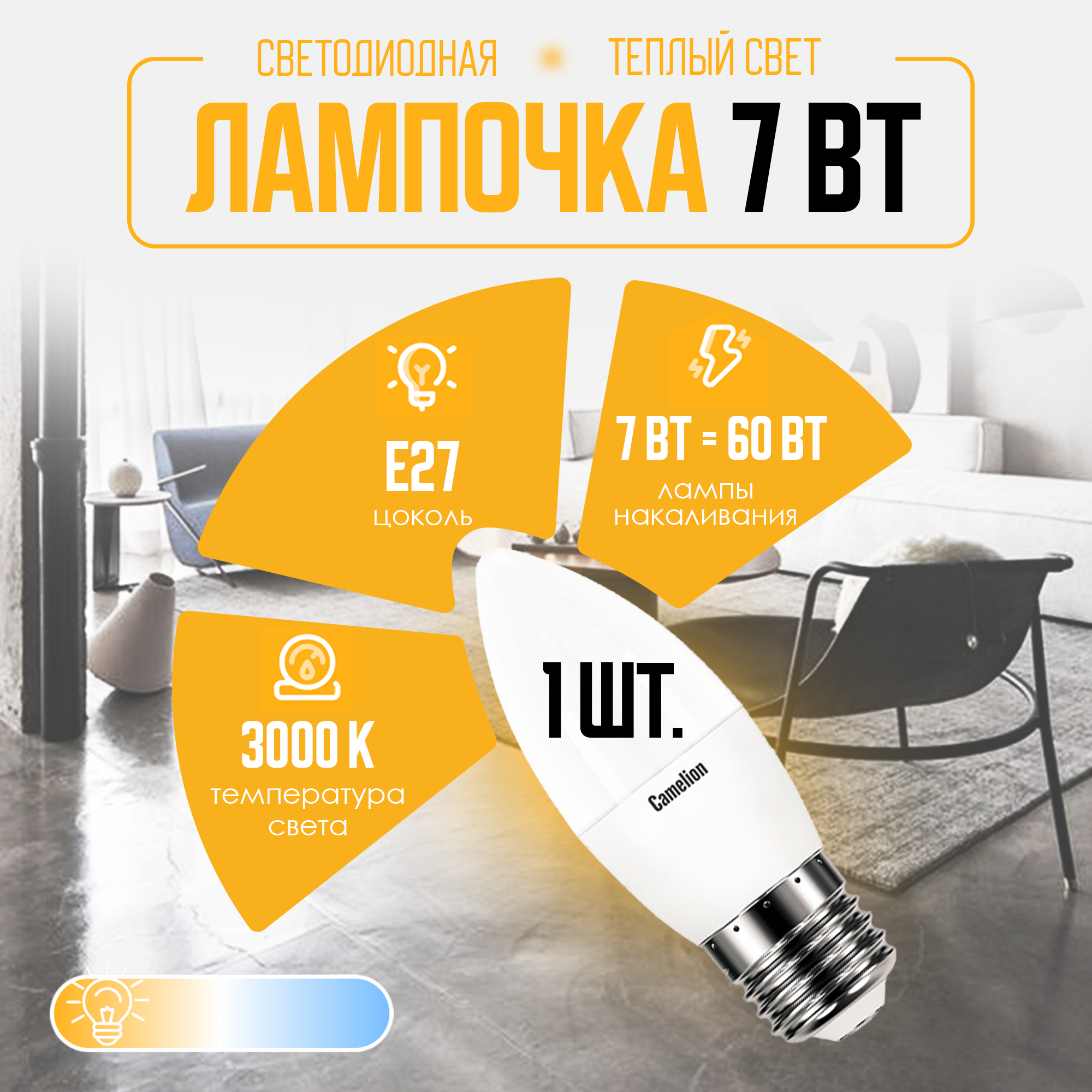 Лампа светодиодная E27, 7 Вт, 60 Вт, свеча, 3000 К, свет теплый белый, Camelion