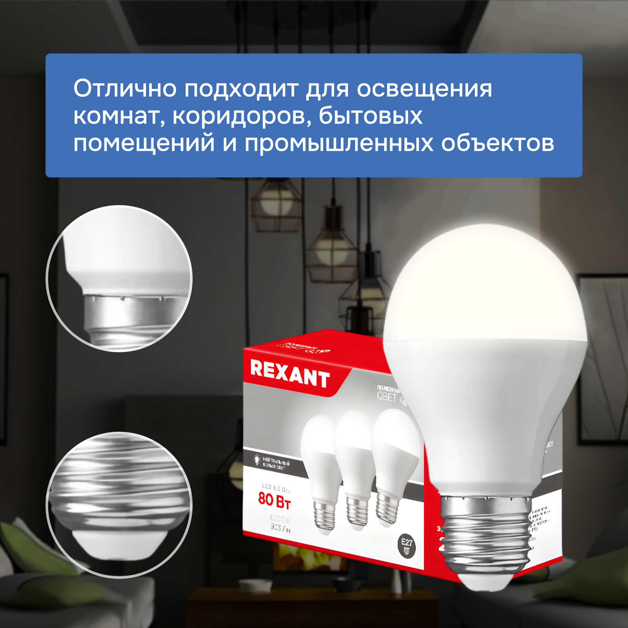 Купить Лампочка светодиодная E27 Груша, REXANT, нейтральный белый свет, 9,5 Вт 4000К, 3 шт.