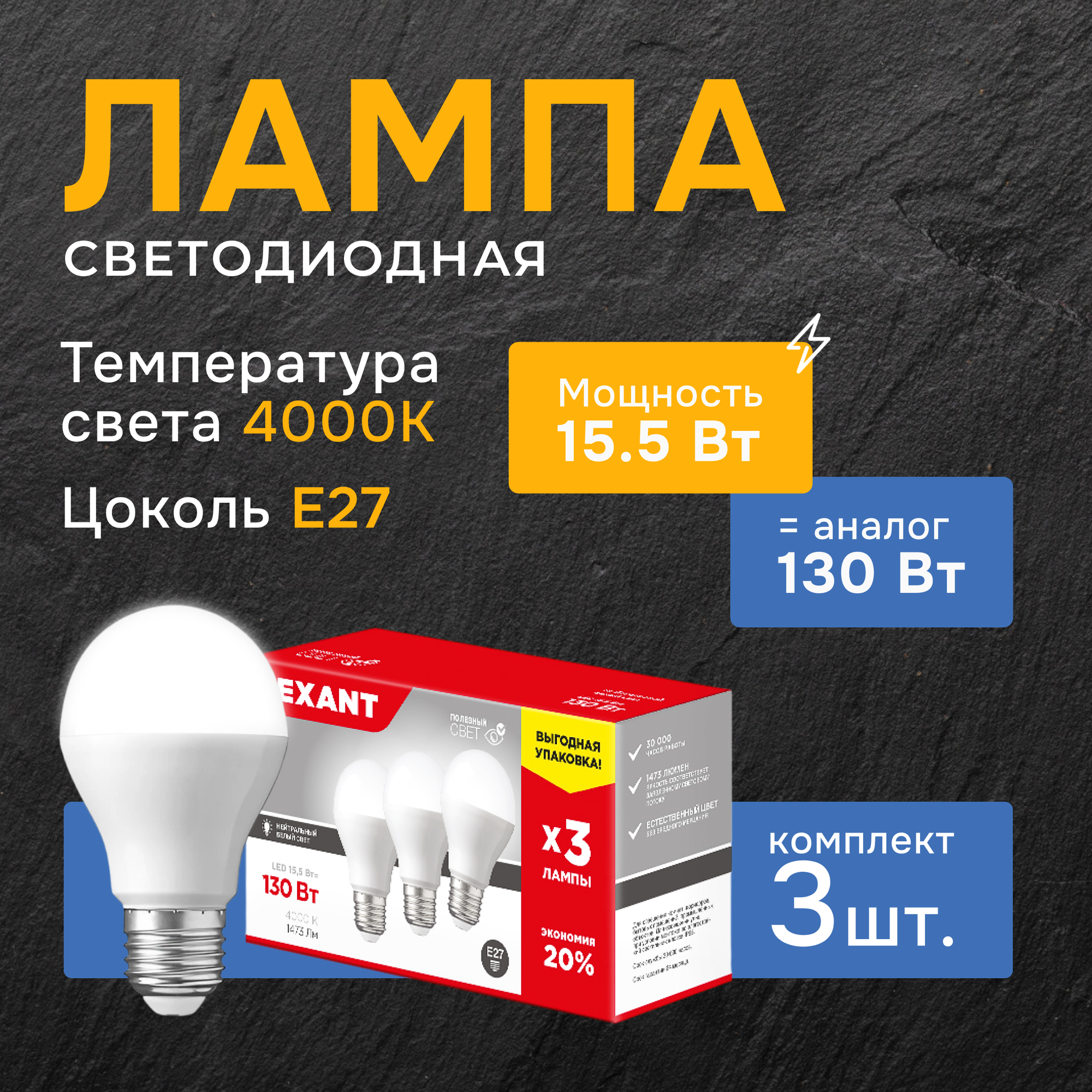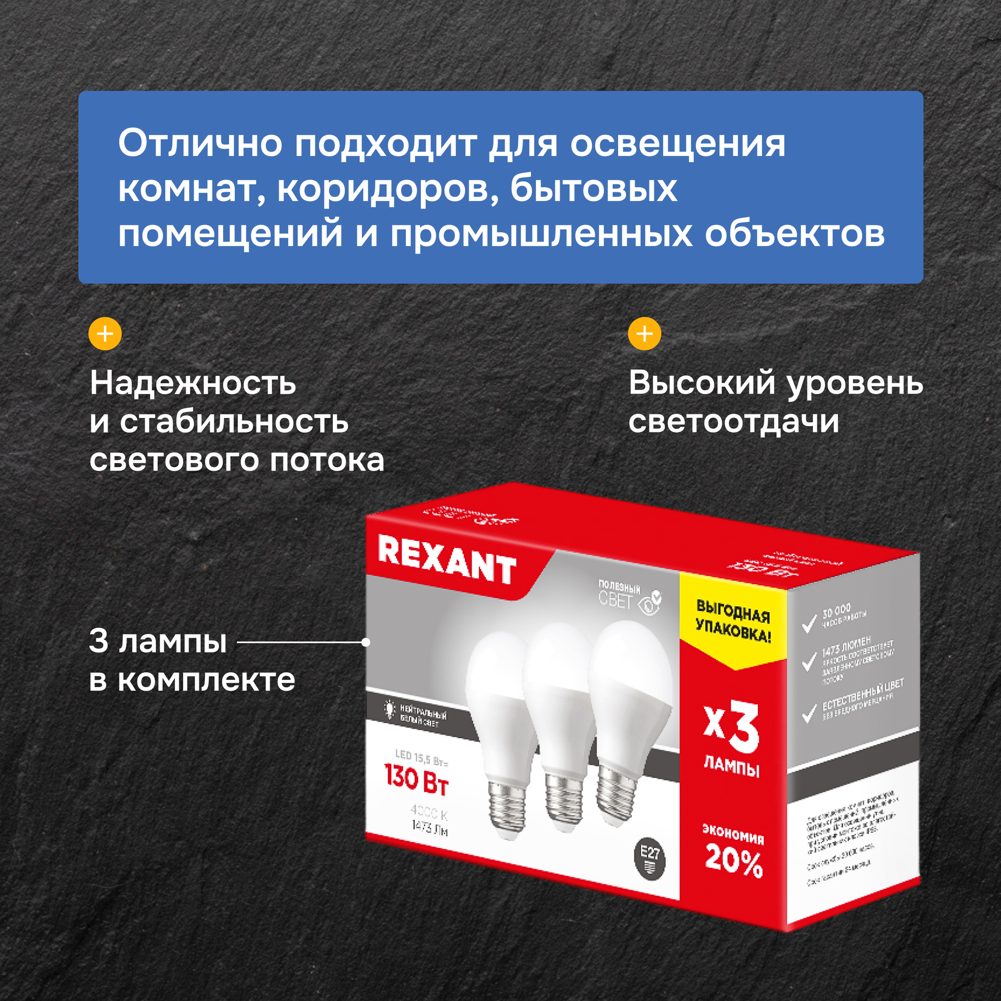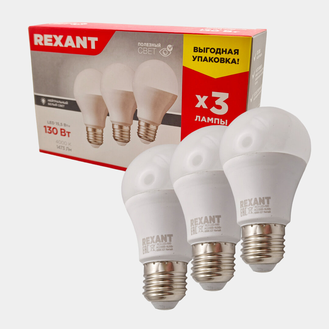 Светодиодная лампа REXANT Груша E27, 15.5 Вт, A60, 1473 Лм (=130 Вт), 4000 K (нейтральный свет), упаковка 3 шт.