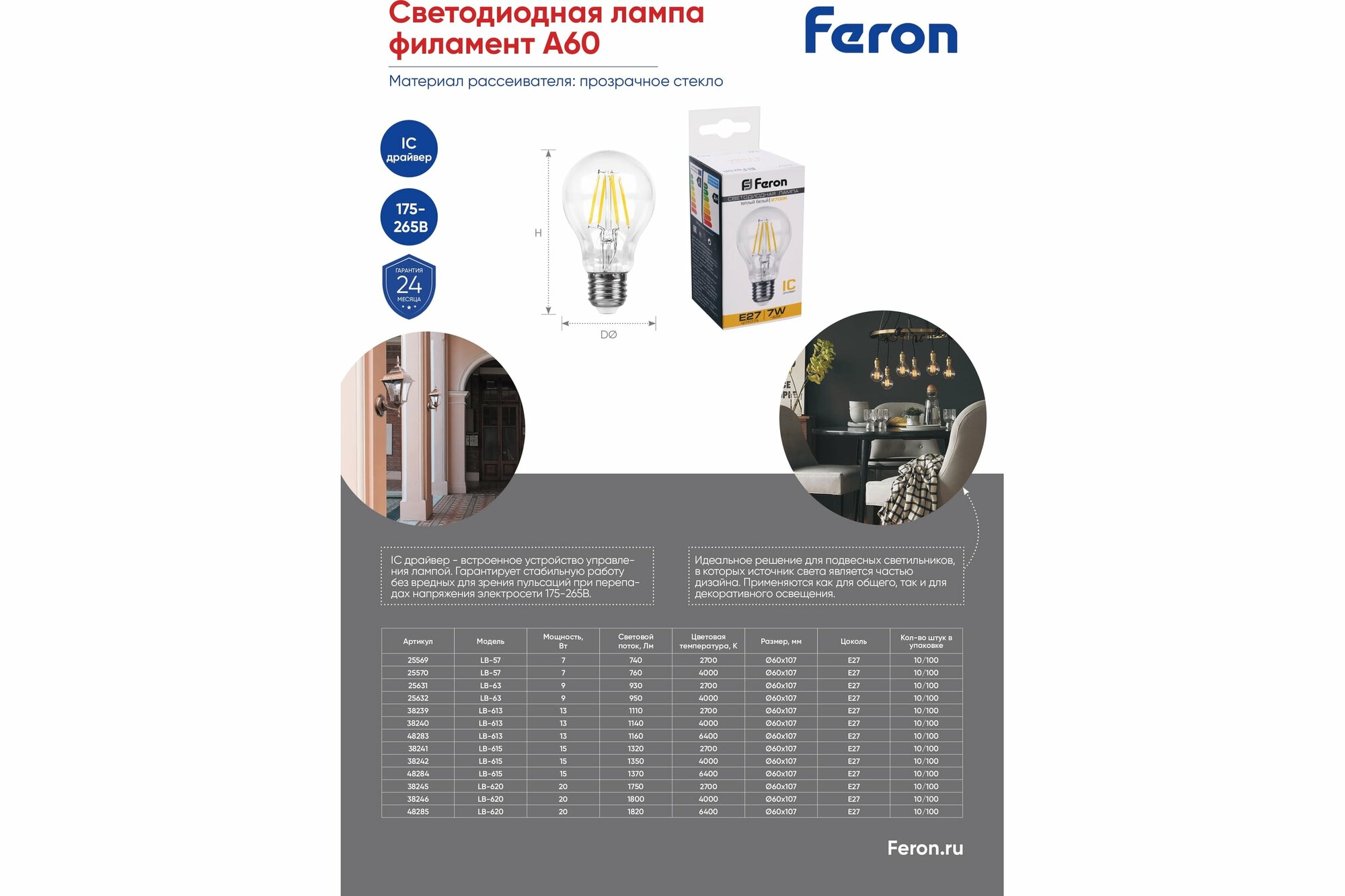 25570 Feron Лампа светодиодная LB-57 7Вт 230V E27 4000K филамент A60 прозрачная