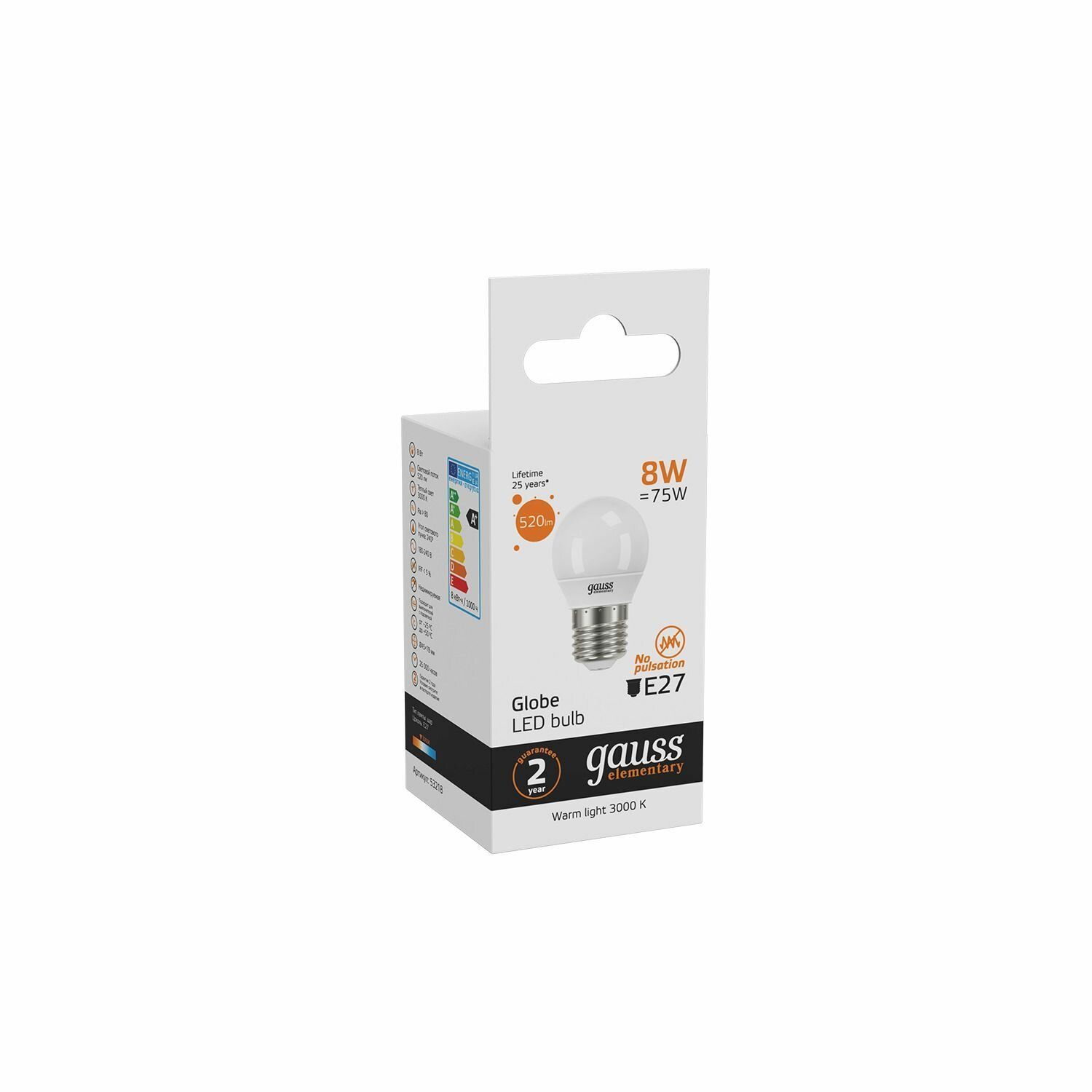 (10 шт)Лампа Gauss Elementary Шар 8W 520lm 3000K Е27 LED 1/10/100