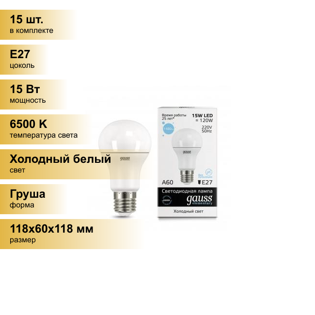 Сохранить(15 шт.) Светодиодная лампочка Gauss Elementary ЛОН A60 E27 15W(1480lm) 6500K 6K 118x60 матовая, пластик/алюм. 23235 Холодный белый. Цоколь E27 интересное:
