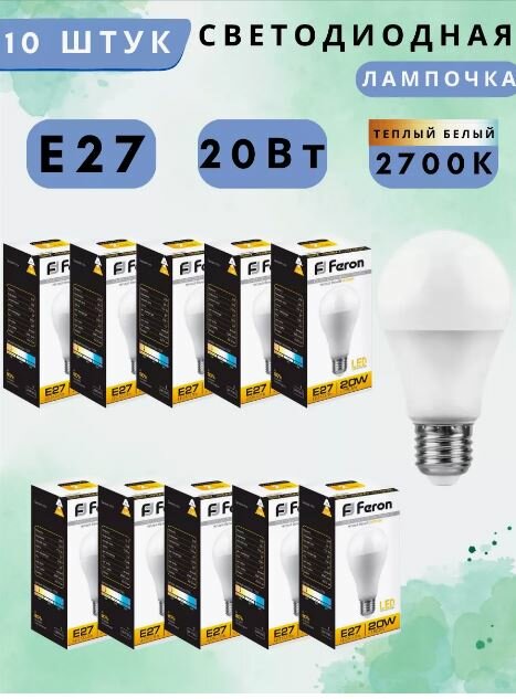 (10 шт.) Светодиодная лампочка Feron ЛОН A65 E27 20W(1750lm) 2700K 2K матовая 135x65, LB-98 25787 Теплый белый. Цоколь E27