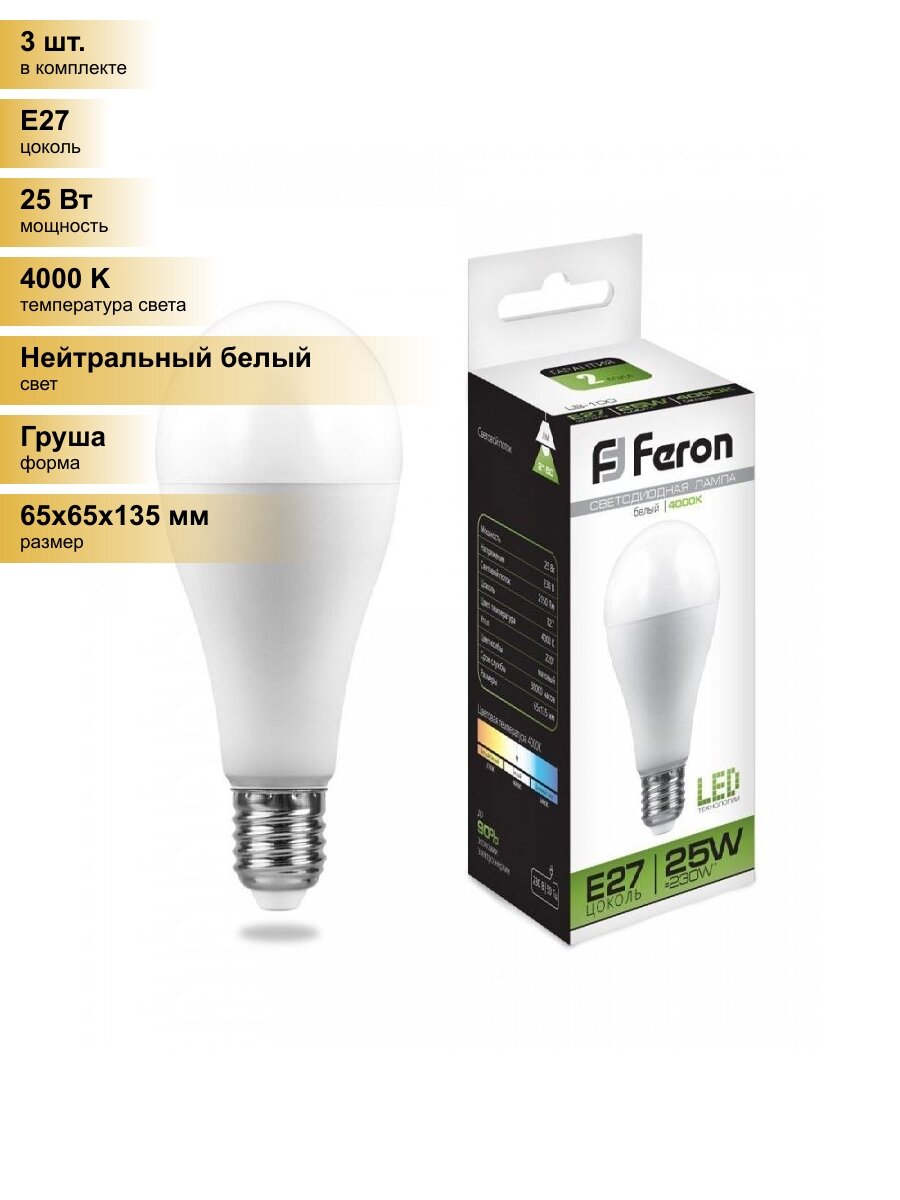 Купить (3 шт.) Светодиодная лампочка Feron ЛОН A65 E27 25W(2150lm) 4000K 4K матовая 135x65, LB-100 25791 Нейтральный белый. Цоколь E27