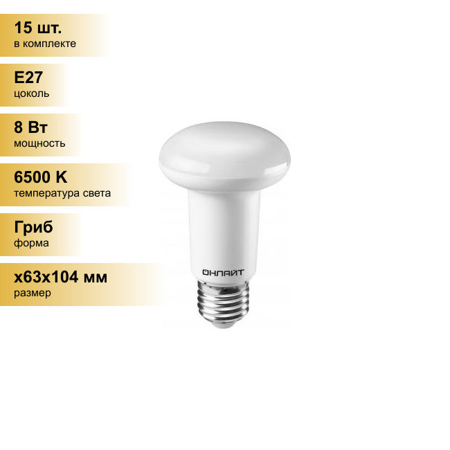 (15 шт.) Светодиодная лампочка онлайт R63 E27 8W(690Lm) 6500K 6K 104x63 OLL-R63-8-230-6.5K-E27 61143 Холодный белый. Цоколь E27