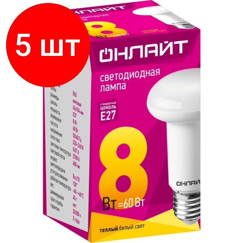 Купить Комплект 5 штук, Лампа светодиодная онлайт OLL-R63-8-230-2.7K-E27 8Вт E27 2700К 71653