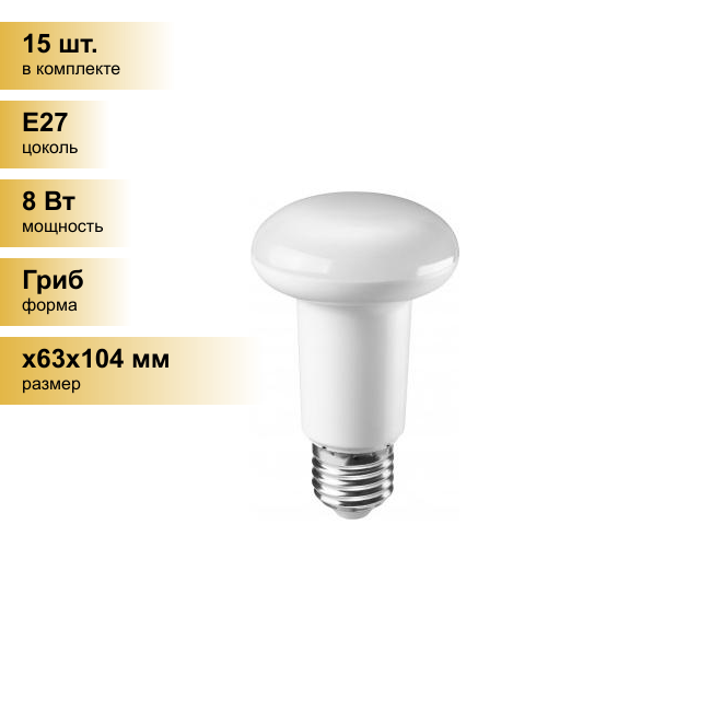 Купить (15 шт.) Светодиодная лампочка онлайт R63 E27 8W(600Lm) 2700K 2K 104x63 ОLL-R63-8-230-2.7K-E27 71653 . Цоколь E27