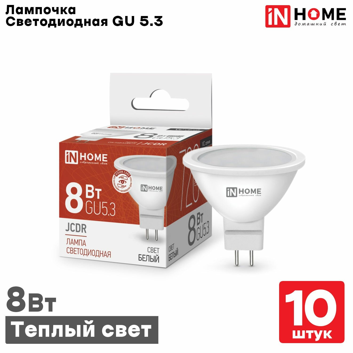 (10 шт.) Светодиодная лампочка IN HOME JCDR, мощность 6 Вт, напряжение питания 220 В, цветовая температура 3000К, теплый белый свет, цоколь GU5.3, размер 50х51 мм