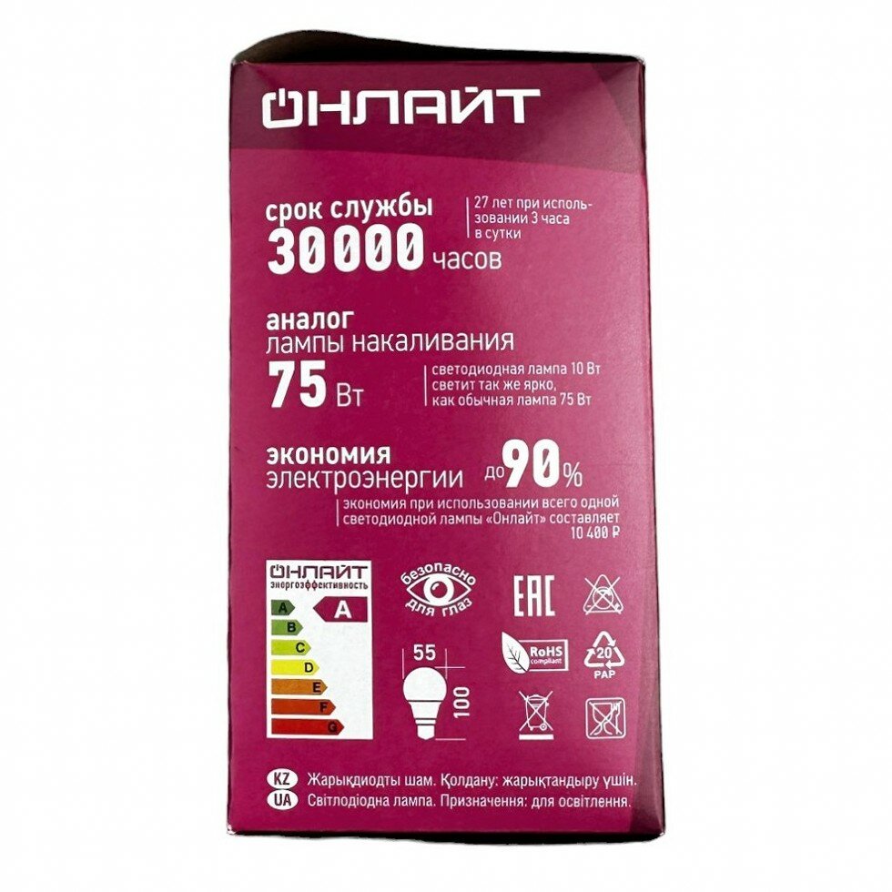 Лампа светодиодная ОНЛАЙТ 71649, E27, A60, 10 Вт, 2700 К