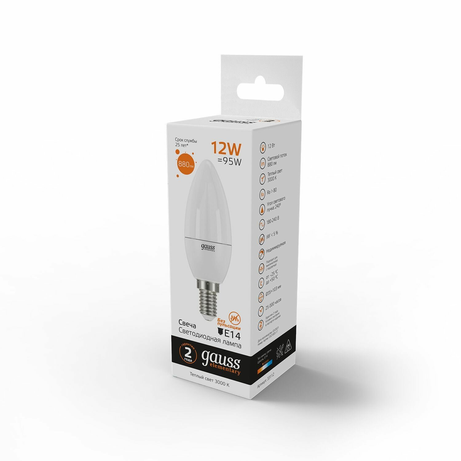 Лампа светодиодная gauss Elementary 33112, E14, B35, 12 Вт, 3000 К