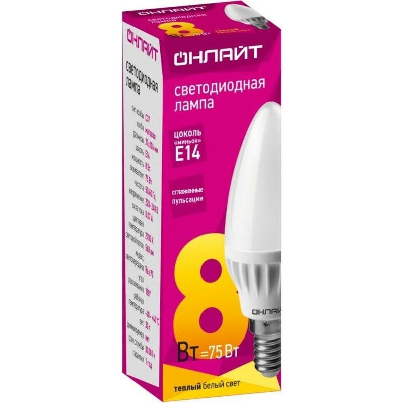 (20 шт.) Светодиодная лампочка онлайт свеча C37 E14 8W(560lm) 2700K 2K 106x37 OLL-C37-8-230-2.7K-E14-FR 71632 Теплый белый. Цоколь E14