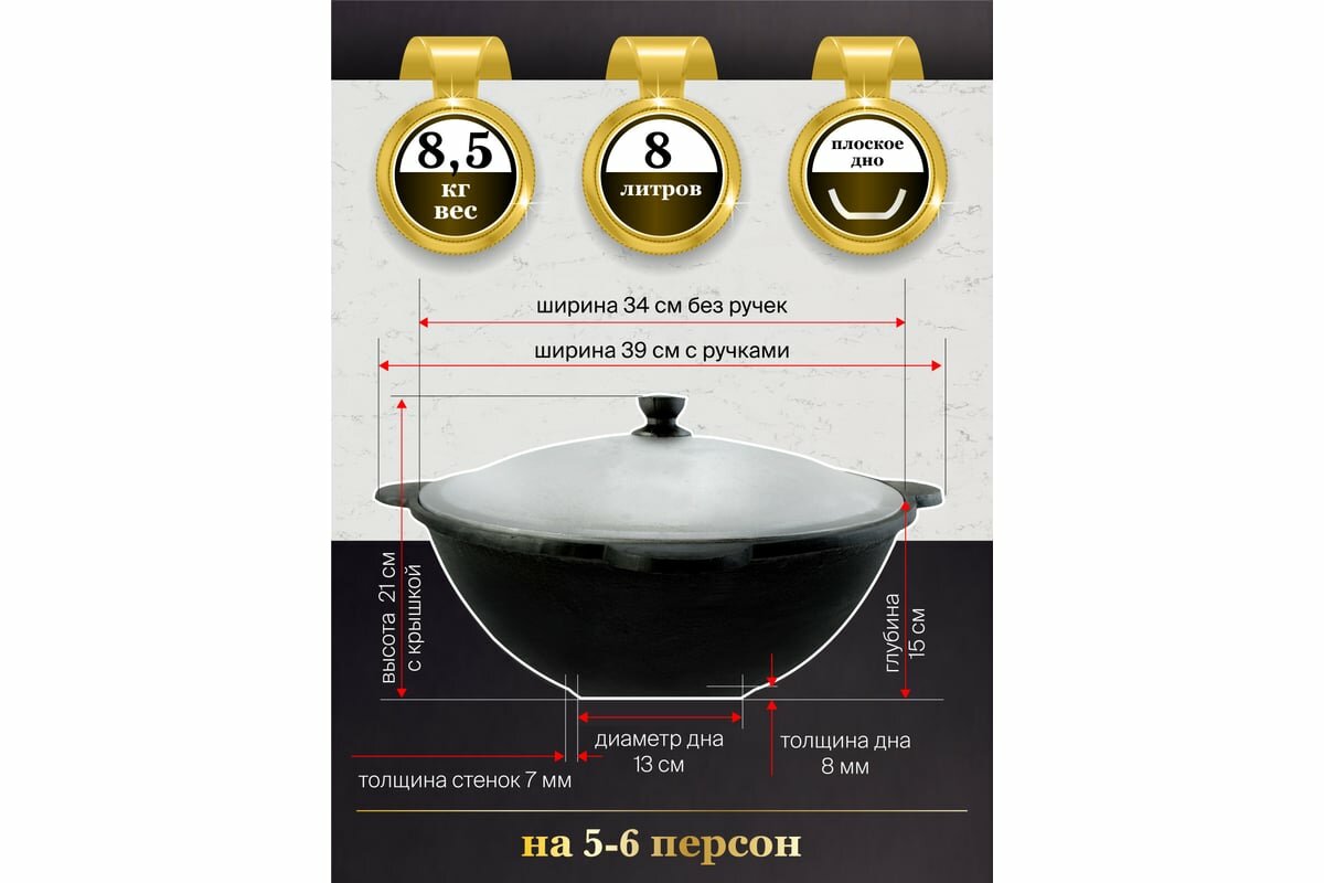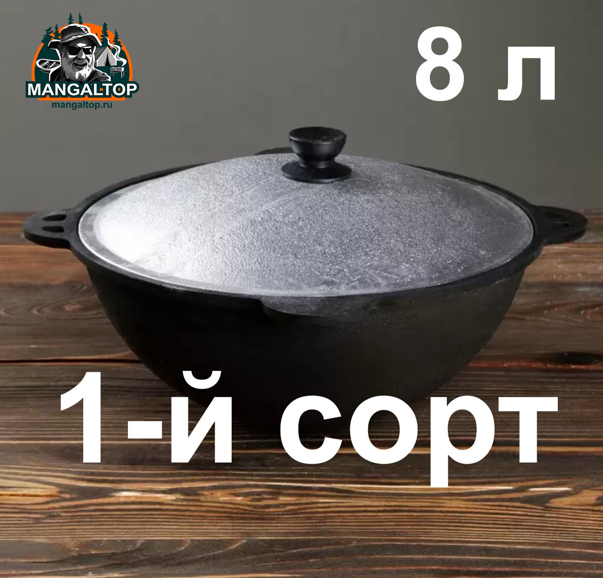 Казан Узбекский чугунный 8 литров (плоское дно) с алюминиевой крышкой