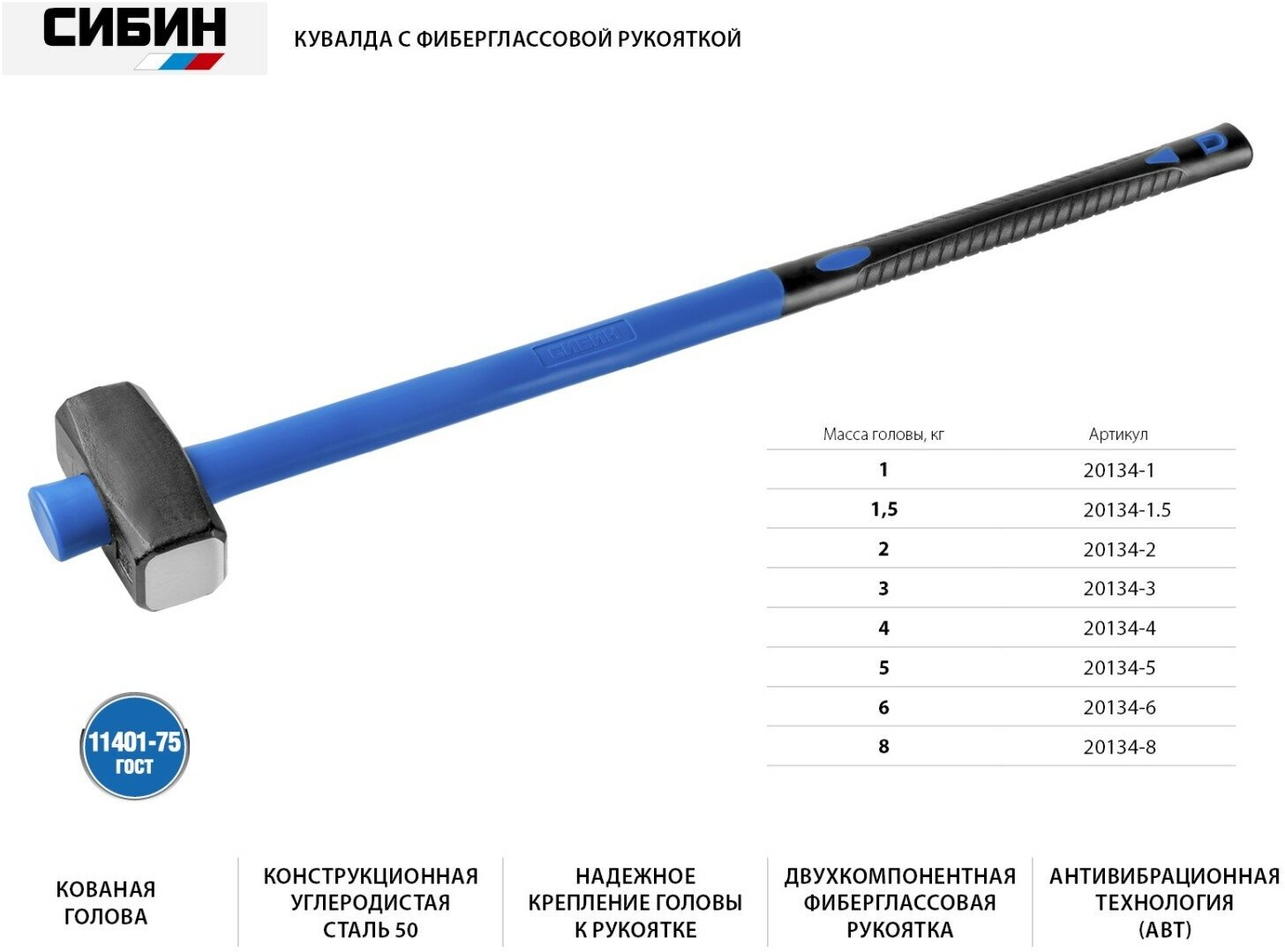 СИБИН Кувалда с фиберглассовой рукояткой СИБИН, обратный всад, 3 кг, ( 20134-3 )