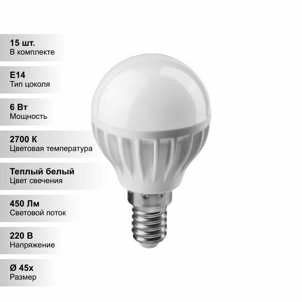 Сохранить(15 шт.) Светодиодная лампочка онлайт G45 6Вт 230В 2700K E14 интересное: