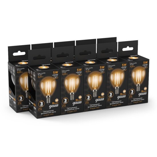 Сохранить(1 шт.) Светодиодная лампочка Gauss Filament Шар G45 E14 5W(420lm) 2700K 2K 80x45 филамент (нитевидная), прозр. 105801105 Теплый белый. Цоколь E14 интересное: