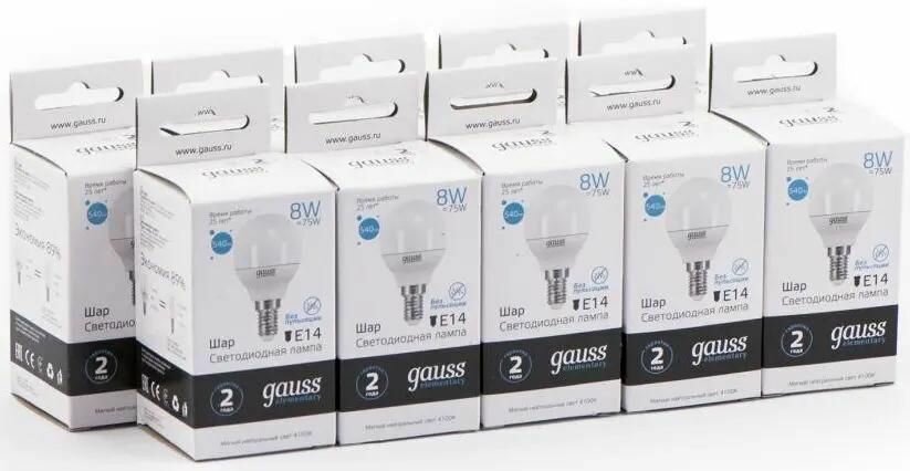 (10 шт)Лампа Gauss Elementary Шар 8W 540lm 4100K Е14 LED 1/10/100