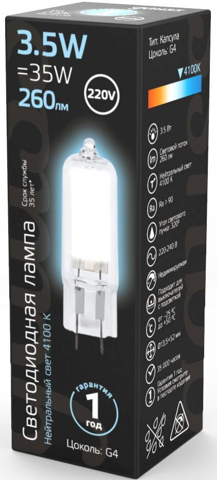 Ниже Вы можете прочитать отзывы на Лампа светодиод. (LED) Капсула G4 3.5Вт 260лм 4100К 230В прозр. Gauss, ознакомится с подробными характеристиками, посмотреть интересные обзоры и фотографии на Лампа светодиод. (LED) Капсула G4 3.5Вт 260лм 4100К 230В прозр. Gauss.