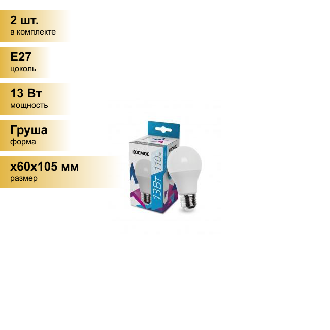 Купить (2 шт.) Светодиодная лампочка Космос ЛОН A60 E27 13W (1150lm) 4500K 4K матов. 108x60 LkecLED13wA60E2745 . Цоколь E27