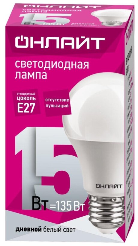 Лампа светодиодная ОНЛАЙТ 61151, E27, A60, 15 Вт, 6500 К